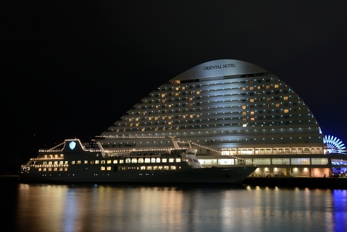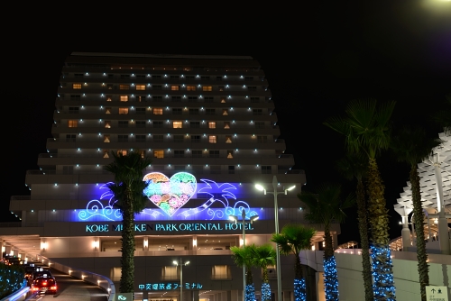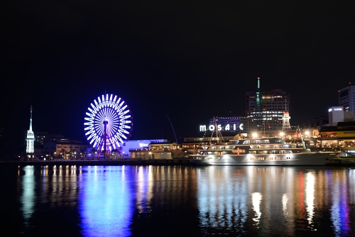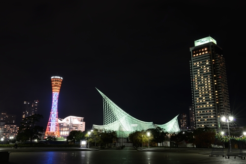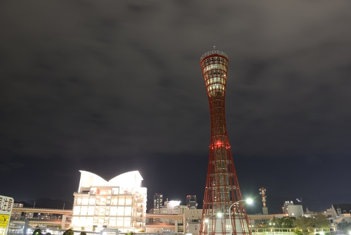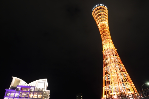 左はライトアップされているポートタワー、右はライトアップ終了後