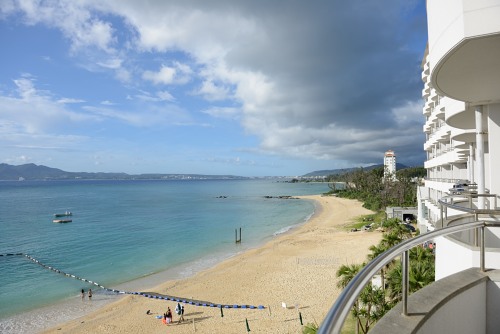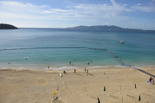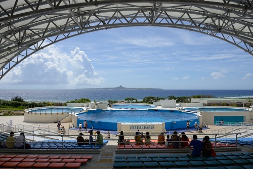 いつものジンベイに挨拶し、エスカレーターで降りていく目の前に伊江島が見える