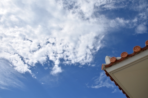 白浜港ターミナルの赤瓦と青空。この青空を見たくて毎年夏、沖縄に来たくなる。