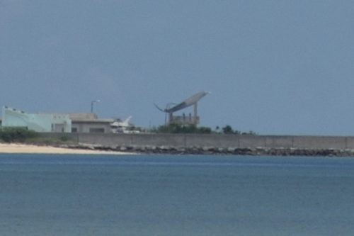 由布島マンタ浜から小浜島を見ると何か斜めになったオブジェが。。。。