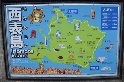 バスターミナルにあった西表島マップ、下に書かれたイリオモテヤマネコの
